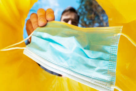 Man throwing a medical mask into a trash can. View from inside the can