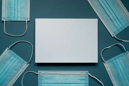 blue protective masks, white rectangular card with space for text, photo from above