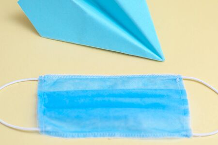 Paper blue airplane with medical blue mask on yellow background. Copy space.