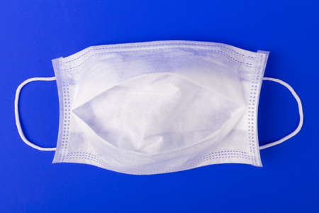 coronavirus COVID-19 pandemic. antiviral medical mask for protection against corona virus. Surgical protective mask. Medical respiratory bandage face on white background. quarantine, stay at home. on blue background