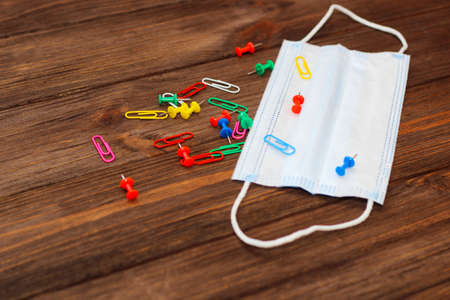 School creative flatley. Multi-colored paper clips and a medical protective mask lie on a wooden table.