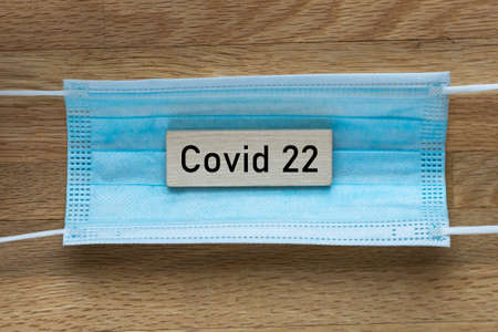 Virus mask and the word Covid 22 on a wooden block, Concept of spreading new strains of the BA4 and BA5 virus