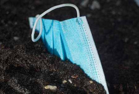 dirty medical mask on grass after virus pandemic