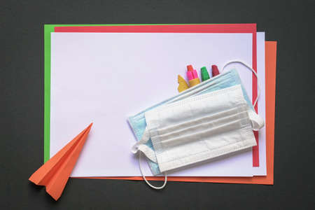 Color papers, crayons, paper plane and medical face mask. Top view. Back to school during covid-19 concept.