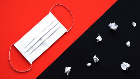 On a red paper lies a mask, on black paper a coronavirus. Art in the art of origami. A medical mask saves people from coronavirus infection. Personal hygiene products against a pandemic.