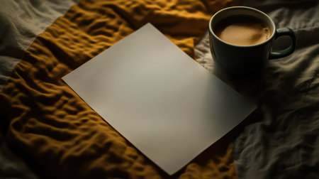 A cozy scene featuring blank piece of paper beside cup of coffee on soft blanket