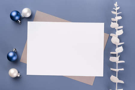 Two white mockup blanks and Christmas decorations on color background. Copy space for the text. Template for Christmas card. Merry Christmas and Happy new year