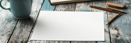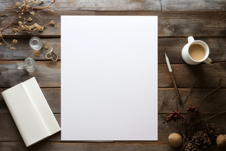 A clean sheet of paper lies on a rustic wooden table accompanied by a coffee cup and writing tools, ideal for creativity.