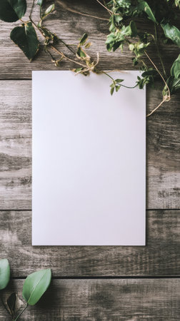 A fresh, blank sheet of paper rests on a rustic wooden table, surrounded by delicate green leaves, creating a tranquil, natural setting.