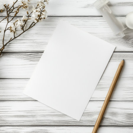 Empty sheet of paper with a pencil and decorative flowers on a wooden surface invites creativity and thoughtful planning in a serene atmosphere.