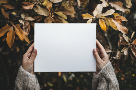 Two hands hold a blank sheet of paper amidst vibrant autumn foliage, creating an inviting atmosphere for creative expression.