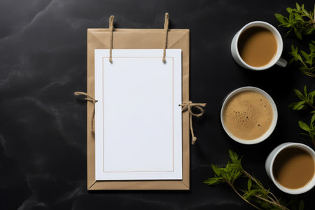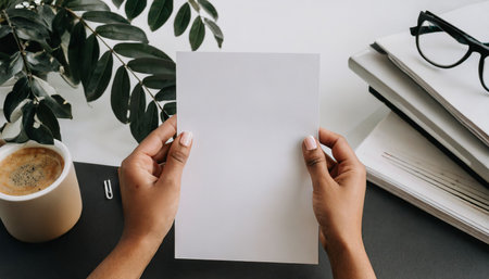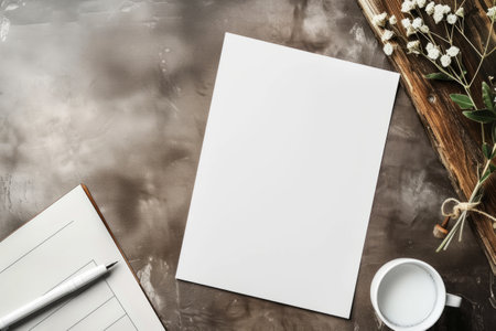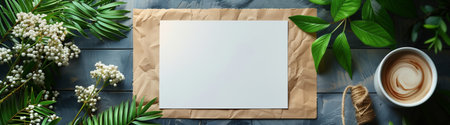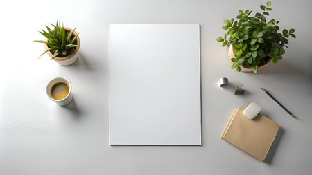 A blank white page of paper on top of an elegant marble desk, with a cup of coffee and potted plants beside it. The background is a soft gray color, highlighting the empty space for text or design elements. This setup creates a sophisticated workspace suitable for professional use. Photorealistic style with high-resolution details. --ar 128:71 --v 6.1 Job ID: 6c9ef9ec-0c80-4545-9349-1dd392173550