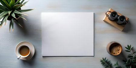 A clean and minimal flat lay featuring a blank white card. a cup of coffee. a potted plant. and vintage binoculars. Perfect for showcasing branding. products. or adding a touch of elegance to your design.