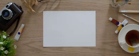 Top view of simple designer workspace with sketch paper, painting tools, coffee cup and decorations on wooden table