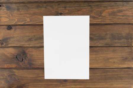 Blank portrait mock-up paper. brochure magazine isolated on brown wooden table, changeable background / white paper isolated on wood