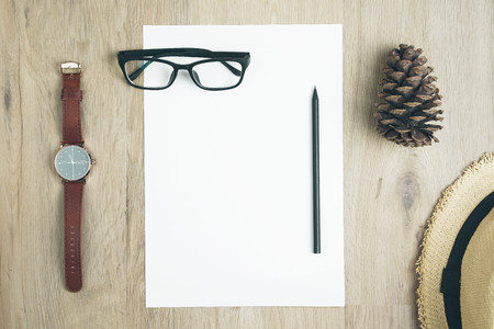 Blank a4 paper on top of wood table with black pencil, pinecone, hat, watch and glasses.