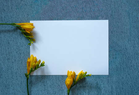 blank invitation or greeting card, painting a paper card with a delicate, beautiful texture, hand-painted background mix of watercolor and tempera paints, decoration natural yellow freesias