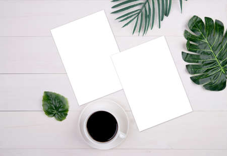 Blank paper sheet copy space with mockup and leaf and cup of coffee on wooden table, poster and invitation, postcard decoration your design or branding, nobody, flat lay, top view.