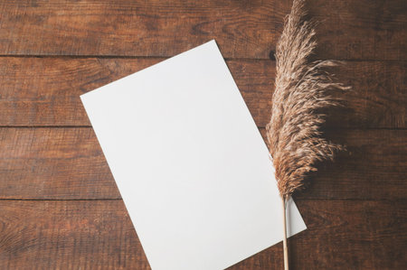 Blank white paper card with dried flowers on it, flat lay workspace concept with copy space, top view photo
