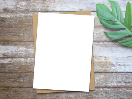 Office desk, Blank white and brown paper and fresh green leaves on wood table background. Top view with copy space.Concept for business and marketing design.