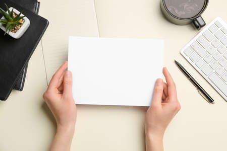 Female hands with blank sheet of paper, cup of coffee, keyboard and stationery on color background