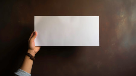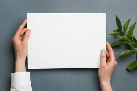 Hands holding blank paper sheet on dark background, top view. Mockup for design.