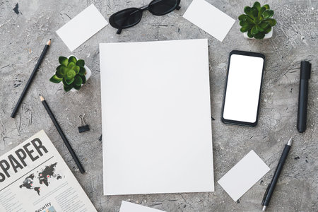 Clean desk workspace mockup empty sheet paper surrounded tech stationery objects creative process flat lay.