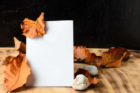 Mockup. A white sheet of paper on a wooden surface, surrounded by autumn leaves and white stones. Selective focus.