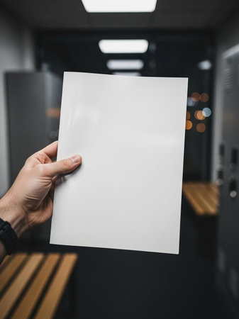 Mens hands holding empty white letterhead on blue wooden background. Blank paper mock-up