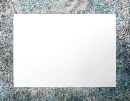 Top view of a blank sheet of white paper lying on a textured wooden rustic desk with dark edges of the image.