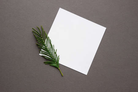 Rectangular vertical or square invitation white greeting card mockup with a boxwood branch. Top view with copy space, pastel light yellow beige background. Template for branding and advertising