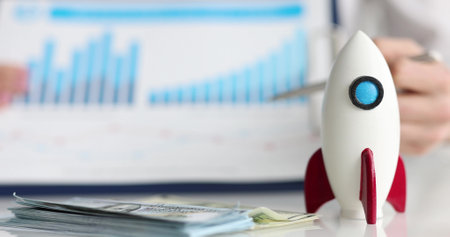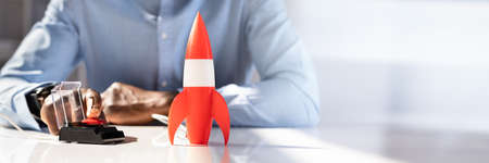 Close-up of miniature rocket standing on table. Macro shot of rocketship as symbol for business project and start-up. Selective focus. Success and growth concept