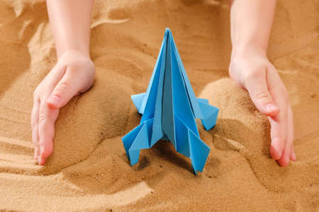 Happy child boy playing with handmade origami paper rocket on beach sand, start up concept