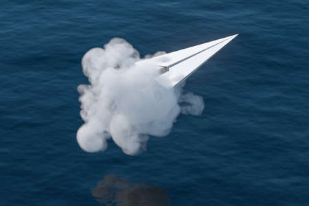 Jet paper plane fly over the ocean, 3d rendering. Computer digital drawing.