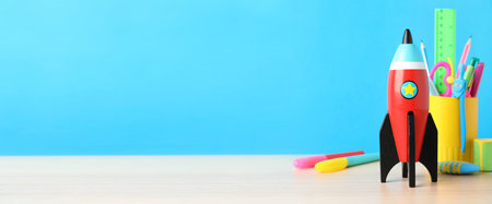 School stationery and rocket on wooden table, space for text. banner design