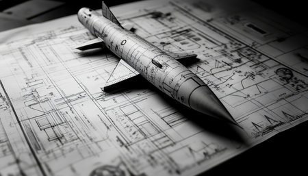 Intricate engineering drawing with missile model on table capturing design precision and detail