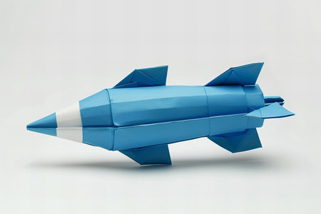 Paper origami rocket flies on a blue background. Space concept. International Day of Human Space Flight, Cosmonautics Day.