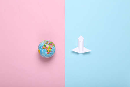 Origami space rocket shuttle and globe on pink blue background. Space flight concept. minimalism