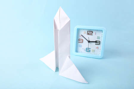 startup. Paper rocket and alarm clock on blue background