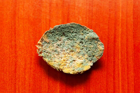 Spores of fungus on bread macro close up view