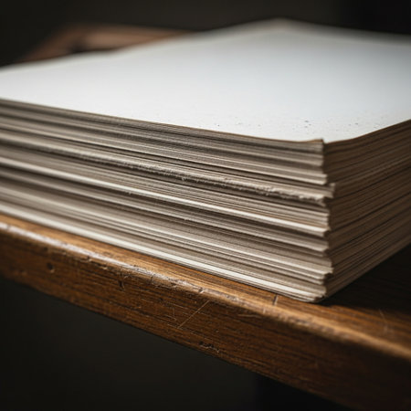 Editorial low-angle photograph capturing a stack of pristine, blank sheet music paper resting on an