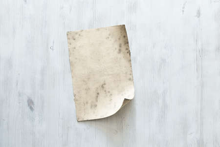 Old shabby piece of watercolor paper on a wooden background. Copy space.