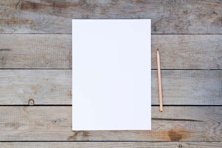 Blank paper with pencil on wooden table.