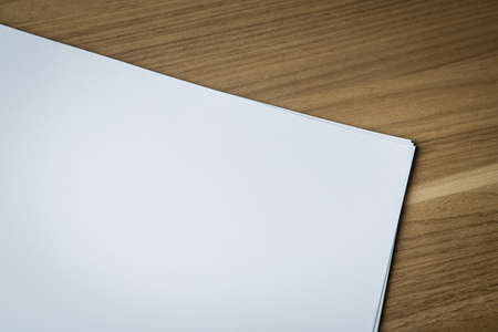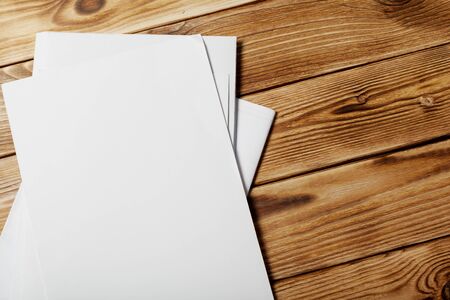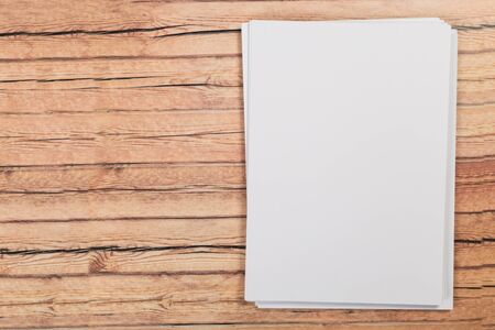 Closeup of blank sheets of paper on a wooden desk with copy space
