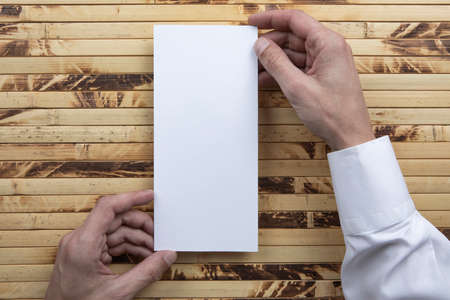 Mens hands holding empty white flyer on bamboo background. Blank paper mock-up