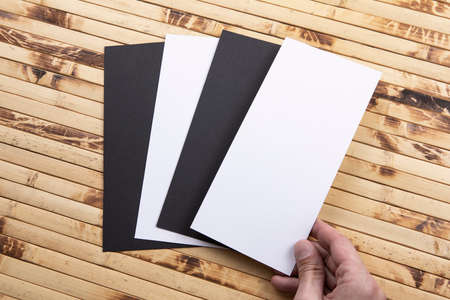 Mens hand holding white and black flyers on bamboo background. Blank paper mock-up