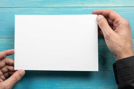 Mens hands holding empty white letterhead on blue wooden background. Blank paper mock-up