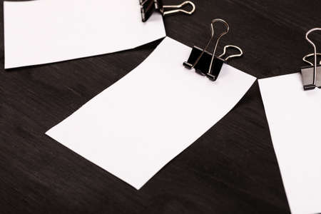 Blank sheets of white paper with paper clip on a black background