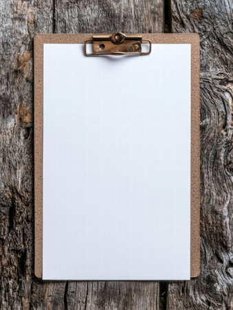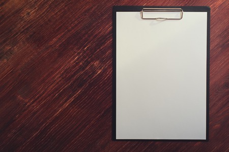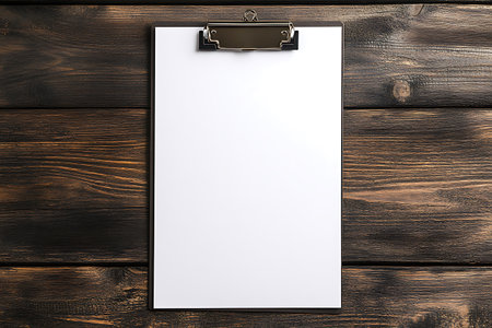 A top-down view shows a blank white paper sheet held by a clipboard, contrasting against a background of dark, distressed wood planks with visible grain patterns.