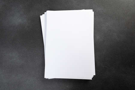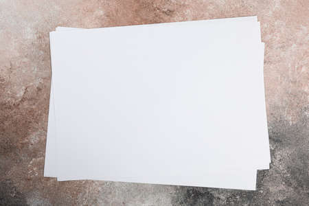 several sheets of paper in a pile of a4 a5 business card on a grunge table.